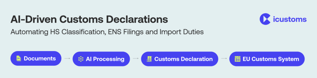 The customs declaration process involves submitting structured shipment data so authorities can assess duties, VAT, and compliance. AI-powered platforms like iCustoms automate this process by extracting data, validating entries, and reducing manual errors before submission.
